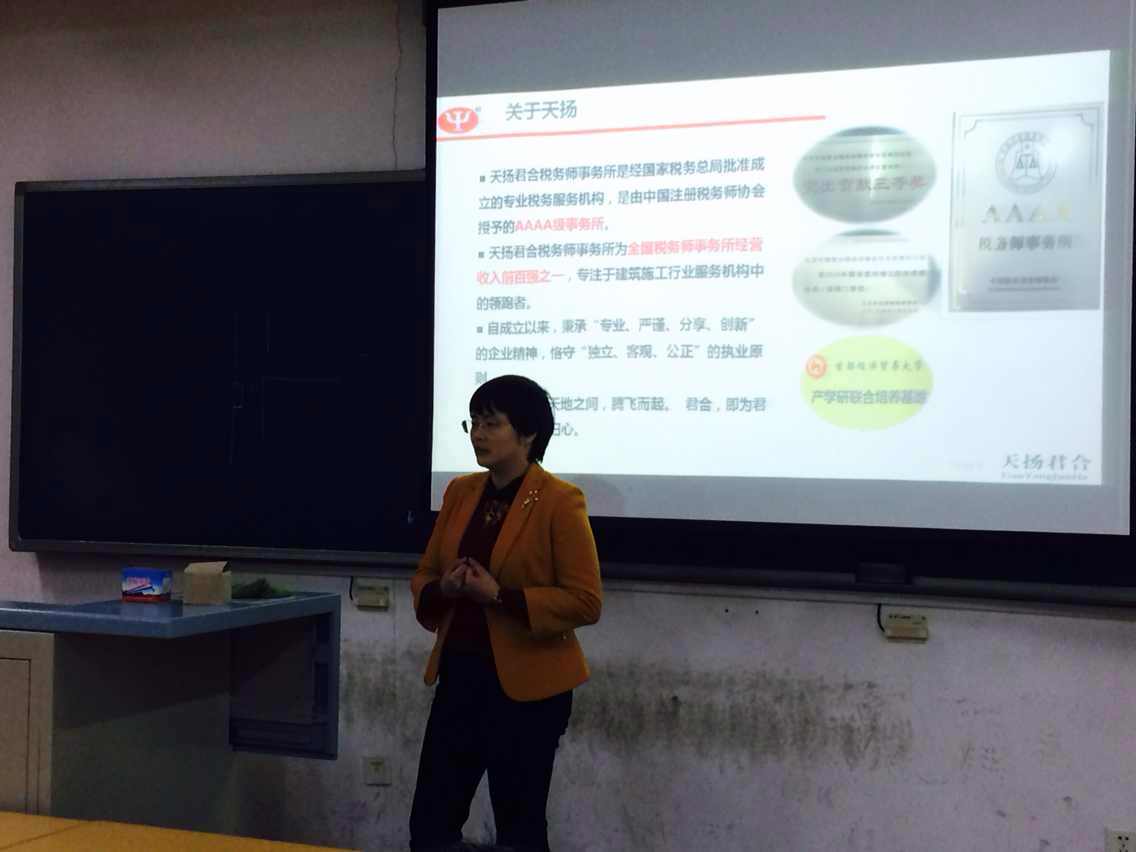 37日上午,天揚財稅服務集團總經理,天揚君和稅務師事務所創始人趙麗女士來到首都經貿大學,為研究生講授了一節生動的稅收相關知識的專題講座。