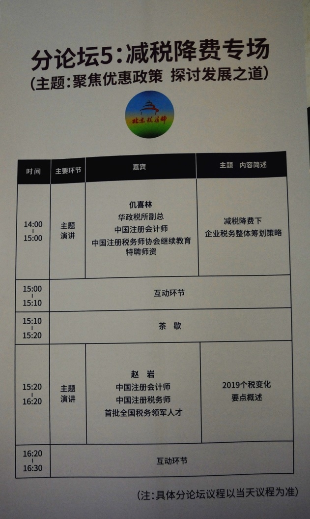 下午14時,北京市稅協圓滿舉辦以“聚焦優惠政策 探尋發展之道”為主題的減稅降費分論壇,胡文學副會長主持此次論壇。華政稅務師事務所、中瑞稅務師事務所的兩位專家分別做了“減稅降費下企業稅務整體籌劃策略”、“2019個稅變化要點概述”主題演講,并現場答疑解惑。聽取論壇的嘉賓對兩位專家的演講解析給予了很高的評價。