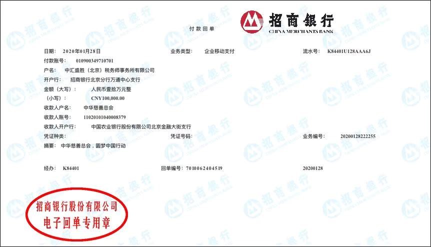 2020年春節,注定是個不平凡的春節,新型冠狀病毒肺炎疫情突發、形勢嚴峻,疫情走向牽動著億萬人民的心,湖北等疫情重點地區正受到空前挑戰。面對仍在肆虐的疫情,作為中華慈善總會圓夢中國行動的顧問,中匯盛勝(北京)稅務師事務所、中匯盛勝(北京)稅務師事務所黨支部向中華慈善總會捐款100,000.00元人民幣,在北京市注冊稅務師協會組織的統一捐贈中捐款120,000.00元人民幣,共計220,000.00元人民幣用于支援湖北抗擊疫情。同時中匯盛勝還向中匯集團的武漢、天津、河南、青海、江西、寧波、廈門等7家公司捐贈了近3000個口罩。另外,公司管理合伙人石君在民建北京市委號召的抗擊疫情捐贈活動中捐款4,000.00元,以實際行動抗擊新型冠狀病毒肺炎疫情,為打贏這場攻堅戰盡我們的綿薄之力。