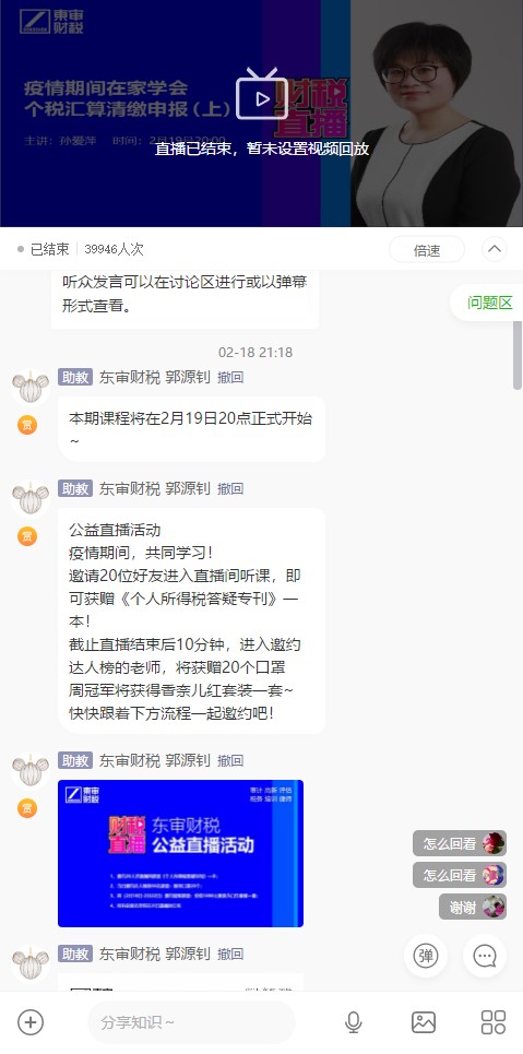 審信東審稅務(wù)師的財稅公益直播課程設(shè)置前沿,主題貼近實際,如疫情防控新政解析系列、公益捐贈、疫情期間在家學(xué)會個稅匯算清繳申報等,還涉及到香港等境外企業(yè)財稅。連續(xù)開播十天來,深受廣大客戶好評。期間交流互動,氣氛活躍。單場在線人次達39946人,并不斷持續(xù)攀升。