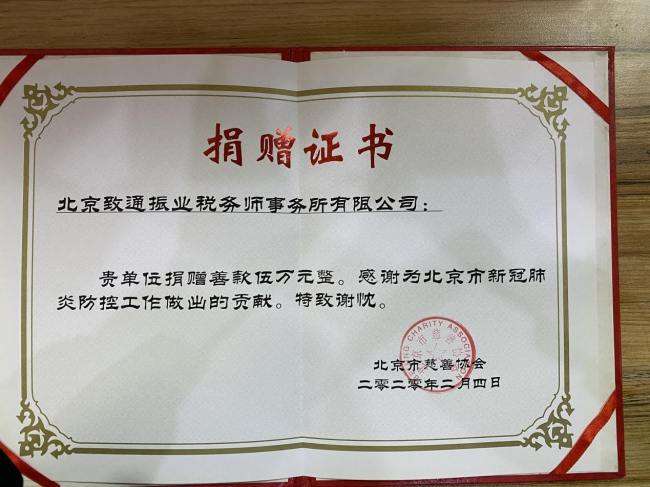在全國上下齊心協力共同抵抗疫情時,致通振業稅務師事務所率先垂范。在大年初五,董事長李記有召開線上董事會,發出“抗擊疫情,我們也應該出一份力”的倡議,得到董事會成員、合伙人一致認同,并將募捐意見反映到北京稅協,積極聯系慈善總會,北京致通振業帶頭將十萬元用于此次疫情防控的款項打到了北京慈善總會和北京海博慈善基金會的賬戶上。