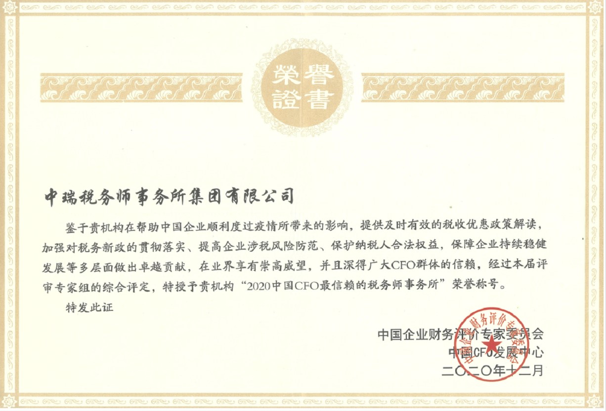 中瑞稅務集團在此次頒獎盛典中被授予“2020中國CFO最信賴的稅務師事務所”榮譽稱號,中瑞稅務集團副總經理趙巖先生代表領獎。疫情期間,中瑞稅務集團提供及時有效的稅收優惠政策解讀、加強對稅務新政的貫徹落實、提高企業涉稅風險防范、保護納稅人合法權益、保障企業持續穩健發展等多層面做出卓越貢獻,深得廣大CFO群體信賴。中瑞稅務集團將繼續為行業的發展貢獻力量。