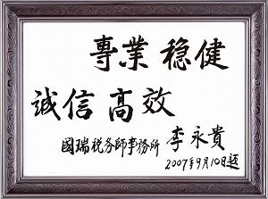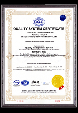 2004年,經(jīng)IAF&PAC QMS MLA認(rèn)可,國(guó)瑞正式通過(guò)ISO9001:2000質(zhì)量管理體系認(rèn)證,成為由中國(guó)質(zhì)量認(rèn)證中心在全國(guó)認(rèn)證通過(guò)的第一家稅務(wù)師事務(wù)所。通過(guò)認(rèn)證的范圍如下:稅務(wù)顧問(wèn),稅務(wù)籌劃,稅務(wù)代理,稅務(wù)咨詢,代理帳務(wù),涉稅審計(jì)和服務(wù)。